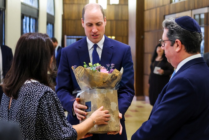 Britain's Prince William receives a bouquet of flowers for his wife Catherine, Princess of Wales, during his visit at the Western Marble Arch Synagogue, in London, Britain, February 29, 2024. NO UK USE FOR 48 HOURS, Credit:Avalon.red / Avalon