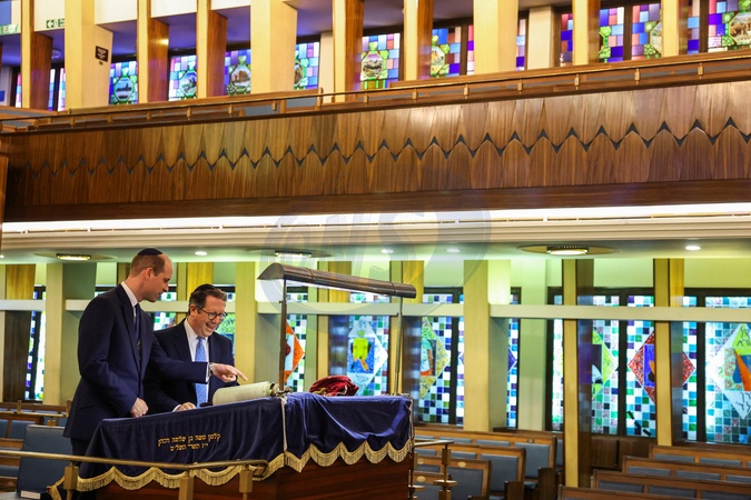 Rabbi Daniel Epstein shows Britain's Prince William a 17th century Torah scroll as he visits the Western Marble Arch Synagogue, in London, Britain, February 29, 2024. NO UK USE FOR 48 HOURS, Credit:Avalon.red / Avalon