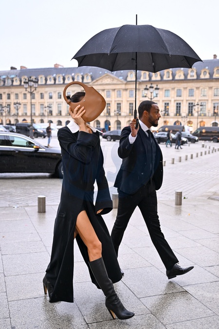 Irina Shayk nie chce, żeby ją fotografowano i filmowano, gdy przybywa, aby pokazać Schiaparelli modę damską na jesień/zimę 2024–2025 podczas Tygodnia Mody w Paryżu (PFW) w Pavillon Vendôme