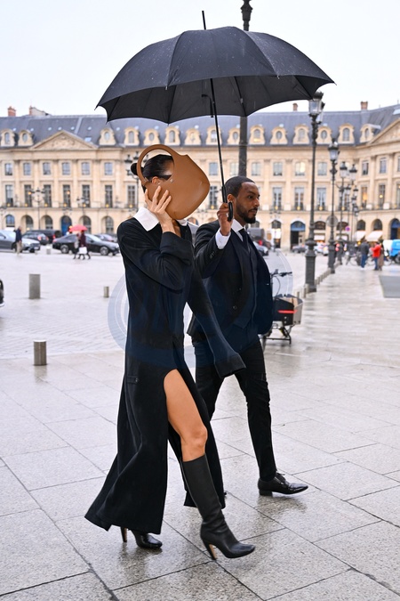 Irina Shayk nie chce, żeby ją fotografowano i filmowano, gdy przybywa, aby pokazać Schiaparelli modę damską na jesień/zimę 2024–2025 podczas Tygodnia Mody w Paryżu (PFW) w Pavillon Vendôme