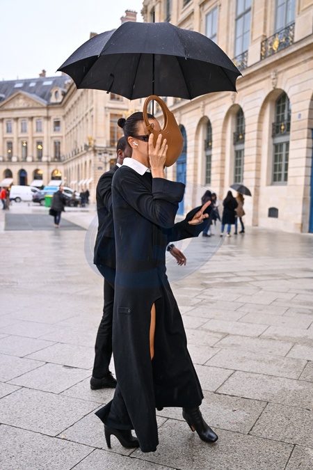 Exclusif - Irina Shayk ne veut pas être photographié à son arrivée pour défiler pour Schiaparelli lors de la mode femme automne / hiver 2024-2025 lors de la Fashion Week de Paris (PFW) au Pavillon Vendôme, à Paris, France, le 29 février 2024. Exclusive - Irina Shayk does not want to be photographed as she arrives to show for Schiaparelli during Fall/Winter 2024-2025 women's fashion during Paris Fashion Week (PFW) at Pavillon Vendôme, in Paris, France, on February 29, 2024.