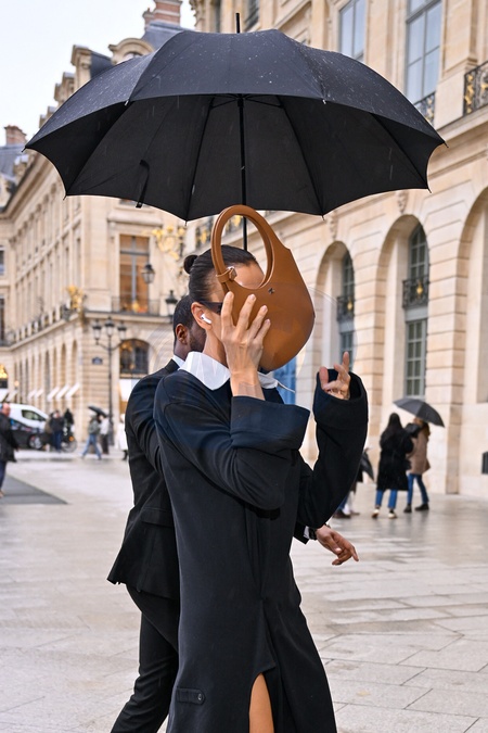Irina Shayk nie chce, żeby ją fotografowano i filmowano, gdy przybywa, aby pokazać Schiaparelli modę damską na jesień/zimę 2024–2025 podczas Tygodnia Mody w Paryżu (PFW) w Pavillon Vendôme