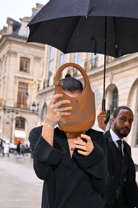 Irina Shayk nie chce, żeby ją fotografowano i filmowano, gdy przybywa, aby pokazać Schiaparelli modę damską na jesień/zimę 2024–2025 podczas Tygodnia Mody w Paryżu (PFW) w Pavillon Vendôme