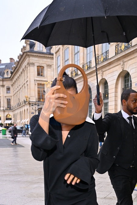 Irina Shayk nie chce, żeby ją fotografowano i filmowano, gdy przybywa, aby pokazać Schiaparelli modę damską na jesień/zimę 2024–2025 podczas Tygodnia Mody w Paryżu (PFW) w Pavillon Vendôme