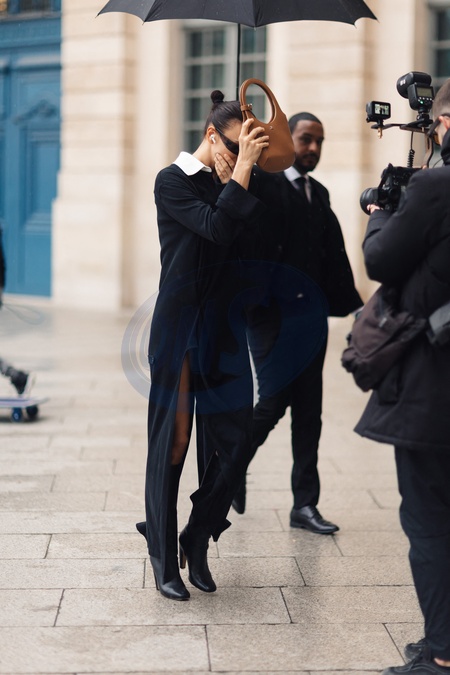 Exclusif - Irina Shayk ne veut pas être photographiée à son arrivée pour défiler pour Schiaparelli lors de la mode femme automne / hiver 2024-2025 lors de la Fashion Week de Paris (PFW) au Pavillon Vendôme
