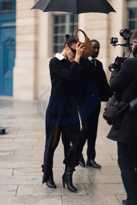 Exclusif - Irina Shayk ne veut pas être photographiée à son arrivée pour défiler pour Schiaparelli lors de la mode femme automne / hiver 2024-2025 lors de la Fashion Week de Paris (PFW) au Pavillon Vendôme