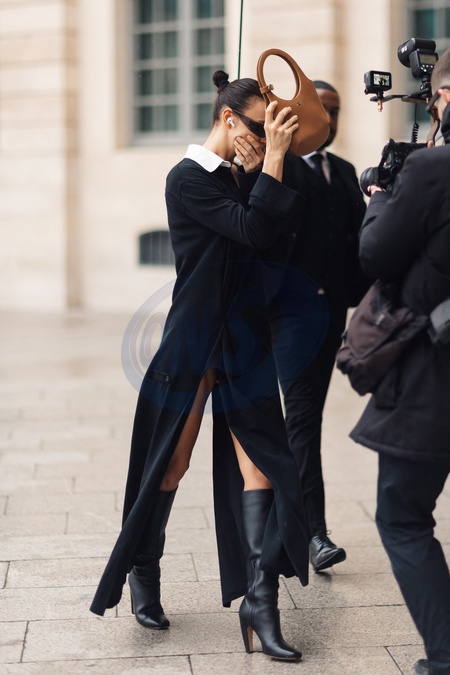 Exclusif - Irina Shayk ne veut pas être photographiée à son arrivée pour défiler pour Schiaparelli lors de la mode femme automne / hiver 2024-2025 lors de la Fashion Week de Paris (PFW) au Pavillon Vendôme