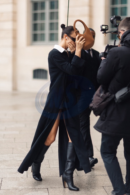 Exclusif - Irina Shayk ne veut pas être photographiée à son arrivée pour défiler pour Schiaparelli lors de la mode femme automne / hiver 2024-2025 lors de la Fashion Week de Paris (PFW) au Pavillon Vendôme, à Paris, France, le 29 février 2024. Exclusive - Irina Shayk does not want to be photographed as she arrives to show for Schiaparelli during Fall/Winter 2024-2025 women's fashion during Paris Fashion Week (PFW) at Pavillon Vendôme, in Paris, France, on February 29, 2024.