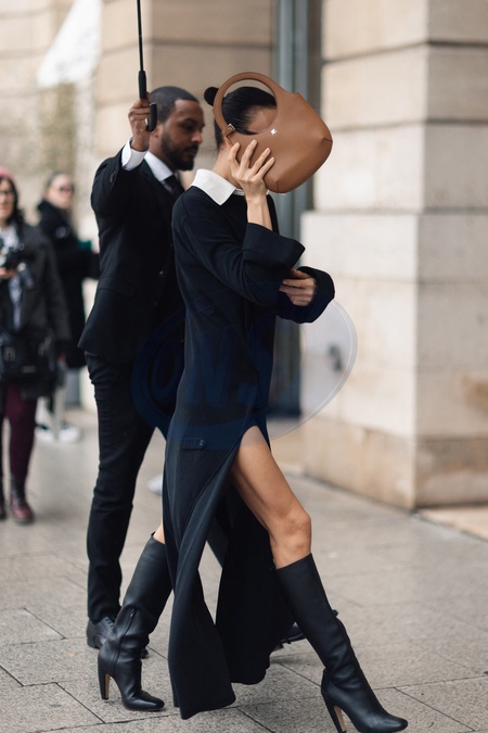 Exclusif - Irina Shayk ne veut pas être photographiée à son arrivée pour défiler pour Schiaparelli lors de la mode femme automne / hiver 2024-2025 lors de la Fashion Week de Paris (PFW) au Pavillon Vendôme, à Paris, France, le 29 février 2024. Exclusive - Irina Shayk does not want to be photographed as she arrives to show for Schiaparelli during Fall/Winter 2024-2025 women's fashion during Paris Fashion Week (PFW) at Pavillon Vendôme, in Paris, France, on February 29, 2024.