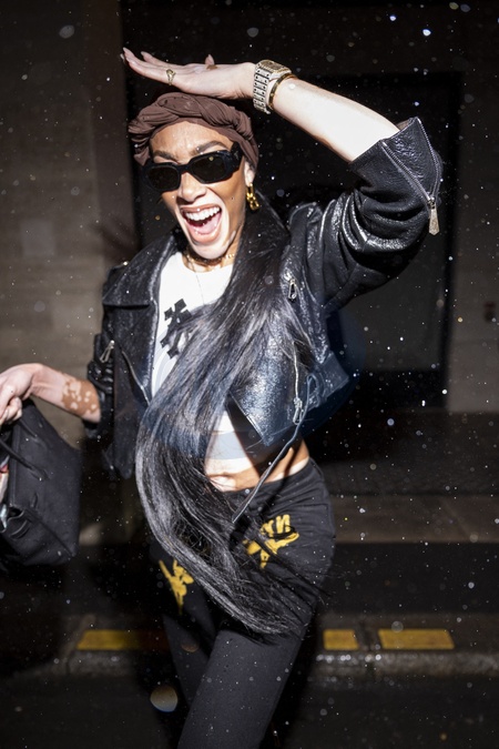 Winnie Harlow próbuje uniknąć deszczu przed hotelem Costes w Paryżu przed tygodniem mody