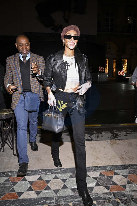 Winnie Harlow essaie d'esquiver la pluie à l'extérieur de l'hôtel Costes à Paris en marge de la fashion week (PFW) le 29 février 2024. © Pierre Perusseau / Tiziano Da Silva / Bestimage Winnie Harlow tries to dodge the rain outside the Costes Hotel in Paris on the sidelines of Fashion Week (PFW) on 29 February 2024.