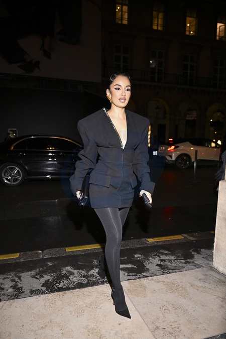 Amina Muaddi arrive à l'hôtel Costes à Paris pendant la fashion week femme automne/hiver 2024-2025 (PFW)