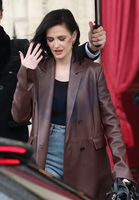 Exclusif - Eva Green quitte l'hôtel "La Réserve" pendant la fashion week femme automne/hiver 2024-2025 (PFW) à Paris le 1er mars 2024. Exclusive - For Germany call for price - Eva Green leaves the "La Réserve" hotel during the fall/winter 2024-2025 women's fashion week (PFW) in Paris on March 1, 2024.