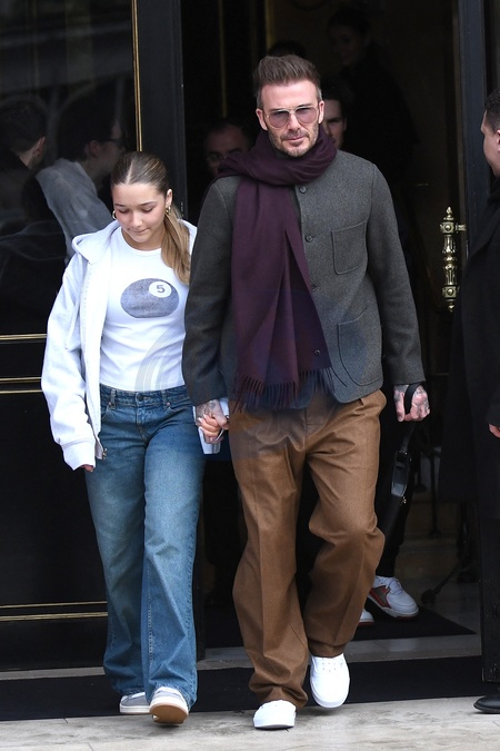 Rodzina Beckhamów opuszcza Hotel La Réserve podczas pokazu mody damskiej jesień/zima 2024–2025 podczas Paris Fashion Week (PFW) w Paryżu, Francja, 1 marca 2024 r. #Rodzina Beckhamów opuszcza Hotel The Reserve jesienią/ Zima 2