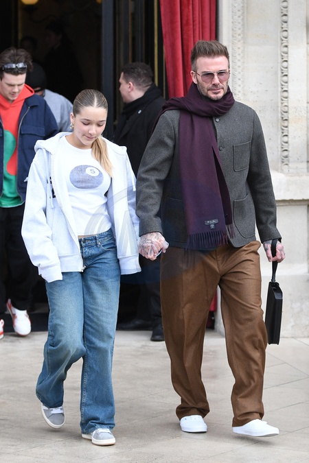 Rodzina Beckhamów opuszcza Hotel La Réserve podczas pokazu mody damskiej jesień/zima 2024–2025 podczas Paris Fashion Week (PFW) w Paryżu, Francja, 1 marca 2024 r. #Rodzina Beckhamów opuszcza Hotel The Reserve jesienią/ Zima 2