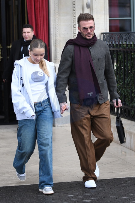 Rodzina Beckhamów opuszcza Hotel La Réserve podczas pokazu mody damskiej jesień/zima 2024–2025 podczas Paris Fashion Week (PFW) w Paryżu, Francja, 1 marca 2024 r. #Rodzina Beckhamów opuszcza Hotel The Reserve jesienią/ Zima 2