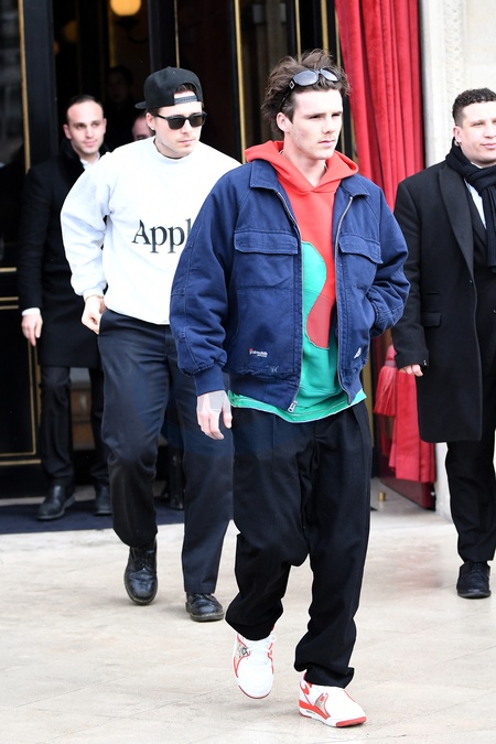 Cruz et Brooklyn - La famille Beckham à la sortie de l'hôtel La Réserve lors de la mode femme automne / hiver 2024-2025 lors de la Fashion Week de Paris (PFW), à Paris, France, le 1 mars 2024. Beckham family leaving the Hotel La Réserve during the Fall/Winter 2024-2025 women's fashion show during Paris Fashion Week (PFW), in Paris, France, on March 1, 2024.