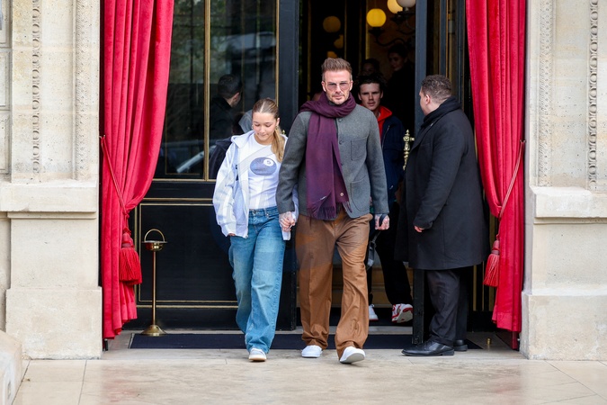 Rodzina Beckhamów opuszcza Hotel La Réserve podczas pokazu mody damskiej jesień/zima 2024–2025 podczas Paris Fashion Week (PFW) w Paryżu, Francja, 1 marca 2024 r. #Rodzina Beckhamów opuszcza Hotel The Reserve jesienią/ Zima 2