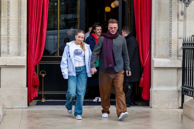Rodzina Beckhamów opuszcza Hotel La Réserve podczas pokazu mody damskiej jesień/zima 2024–2025 podczas Paris Fashion Week (PFW) w Paryżu, Francja, 1 marca 2024 r. #Rodzina Beckhamów opuszcza Hotel The Reserve jesienią/ Zima 2