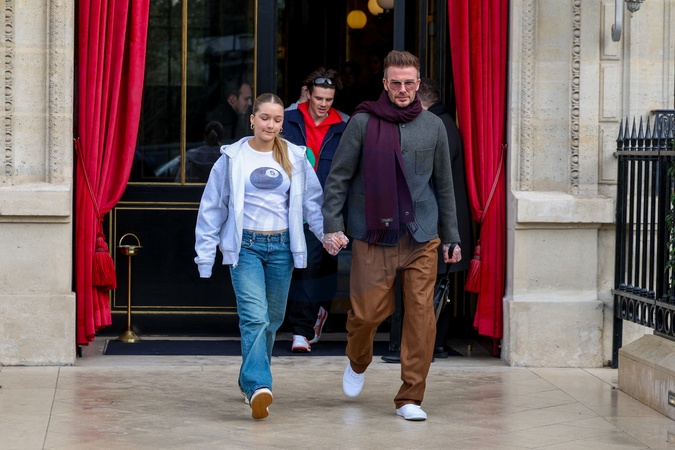 Rodzina Beckhamów opuszcza Hotel La Réserve podczas pokazu mody damskiej jesień/zima 2024–2025 podczas Paris Fashion Week (PFW) w Paryżu, Francja, 1 marca 2024 r. #Rodzina Beckhamów opuszcza Hotel The Reserve jesienią/ Zima 2