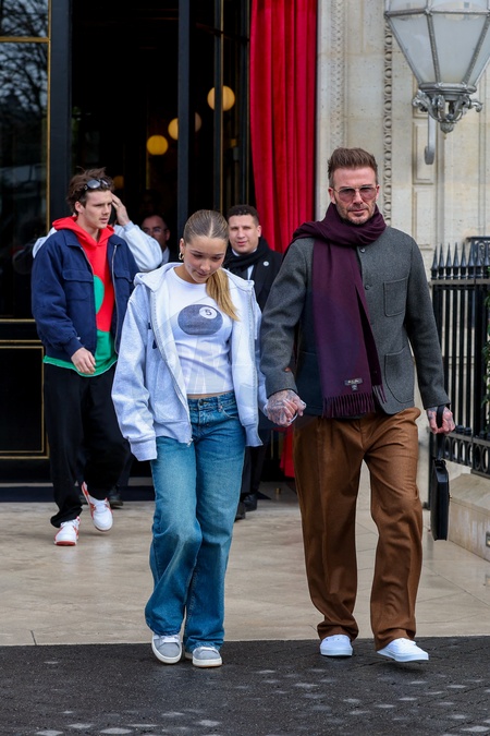 Rodzina Beckhamów opuszcza Hotel La Réserve podczas pokazu mody damskiej jesień/zima 2024–2025 podczas Paris Fashion Week (PFW) w Paryżu, Francja, 1 marca 2024 r. #Rodzina Beckhamów opuszcza Hotel The Reserve jesienią/ Zima 2