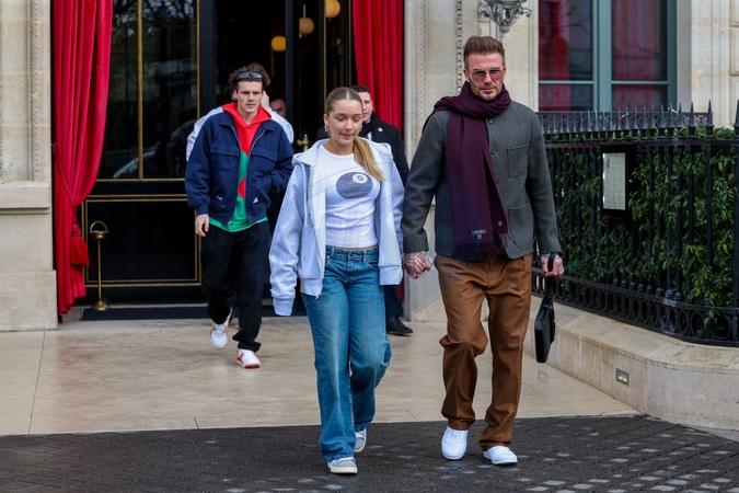 Rodzina Beckhamów opuszcza Hotel La Réserve podczas pokazu mody damskiej jesień/zima 2024–2025 podczas Paris Fashion Week (PFW) w Paryżu, Francja, 1 marca 2024 r. #Rodzina Beckhamów opuszcza Hotel The Reserve jesienią/ Zima 2