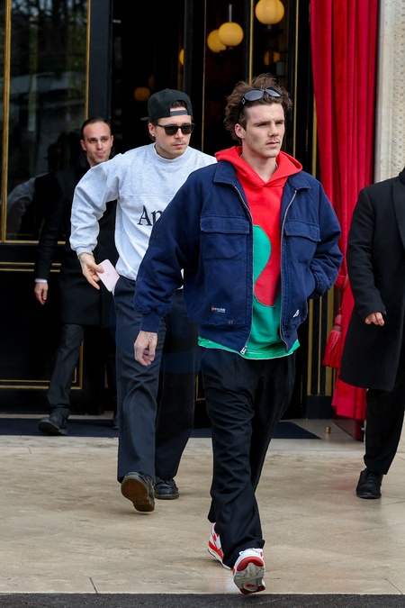 Cruz et Brooklyn - La famille Beckham à la sortie de l'hôtel La Réserve lors de la mode femme automne / hiver 2024-2025 lors de la Fashion Week de Paris (PFW), à Paris, France, le 1 mars 2024. Beckham family leaving the Hotel La Réserve during the Fall/Winter 2024-2025 women's fashion show during Paris Fashion Week (PFW), in Paris, France, on March 1, 2024.