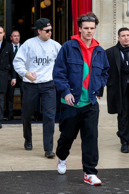 Cruz et Brooklyn - La famille Beckham à la sortie de l'hôtel La Réserve lors de la mode femme automne / hiver 2024-2025 lors de la Fashion Week de Paris (PFW), à Paris, France, le 1 mars 2024. Beckham family leaving the Hotel La Réserve during the Fall/Winter 2024-2025 women's fashion show during Paris Fashion Week (PFW), in Paris, France, on March 1, 2024.