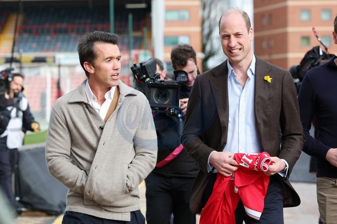 Chairman of Wrexham AFC Rob McElhenney and Prince William, Prince of Wales with his personalised Wrexham AFC shirt on the pitch at the Racecourse Ground after his visit to The Turf Pub, near Wrexham AFC as he marks St. David's Day on March 01, 2024 in Wrexham, Wales.NO UK USE FOR 48 HOURS, Credit:Avalon.red / Avalon