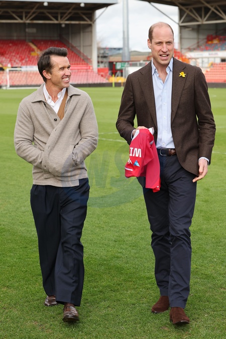 Chairman of Wrexham AFC Rob McElhenney and Prince William, Prince of Wales with his personalised Wrexham AFC shirt on the pitch at the Racecourse Ground after his visit to The Turf Pub, near Wrexham AFC as he marks St. David's Day on March 01, 2024 in Wrexham, Wales.NO UK USE FOR 48 HOURS, Credit:Avalon.red / Avalon