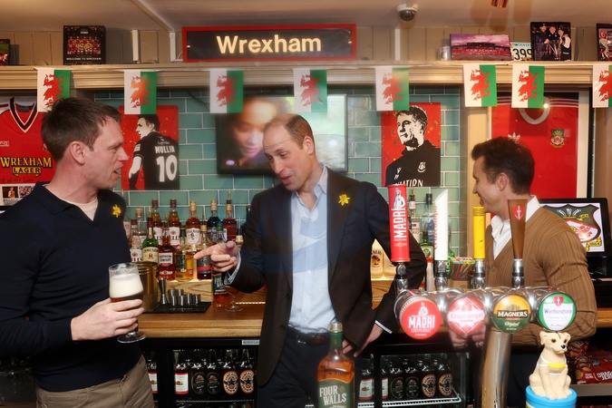 Prince William, Prince of Wales (C) and Chairman of Wrexham AFC Rob McElhenney (R) share a drink at The Turf Pub, near Wrexham AFC as he marks St. David's Day on March 01, 2024 in Wrexham, Wales.NO UK USE FOR 48 HOURS, Credit:Avalon.red / Avalon