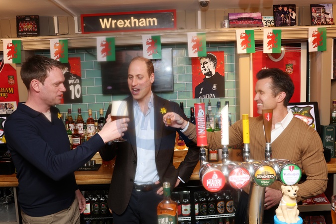 Prince William, Prince of Wales (C) and Chairman of Wrexham AFC Rob McElhenney (R) share a drink at The Turf Pub, near Wrexham AFC as he marks St. David's Day on March 01, 2024 in Wrexham, Wales.NO UK USE FOR 48 HOURS, Credit:Avalon.red / Avalon