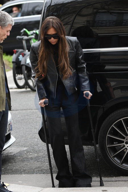 Exclusif - Victoria Beckham arrive à l'hôtel La Réserve lors de la mode femme automne / hiver 2024-2025 lors de la Fashion Week de Paris (PFW), à Paris, France, le 1er mars 2024. La Spice Girl de 49 ans s'est cassée le pied le jour de la Saint-Valentin après être tombée à la salle de sport. Exclusive - For Germany Call For Price - Victoria Beckham arrives at Hotel La Réserve during the Fall/Winter 2024-2025 women's fashion show during Paris Fashion Week (PFW), in Paris, France, March 1, 2024.