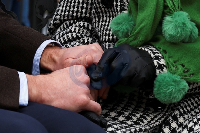Britain's Prince William holds hands with Ruby McBurney, a surviving child of a Gresford Disaster victim, as they meet during a visit to the Gresford Colliery Disaster memorial in Wales, Britain March 1, 2024., Credit:Molly Darlington / Avalon