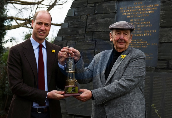Alan Jones, chairman of Gresford disaster memorial, poses for a picture with Britain's Prince William, during his visit to the Gresford Colliery Disaster memorial in Wales, Britain March 1, 2024., Credit:Molly Darlington / Avalon