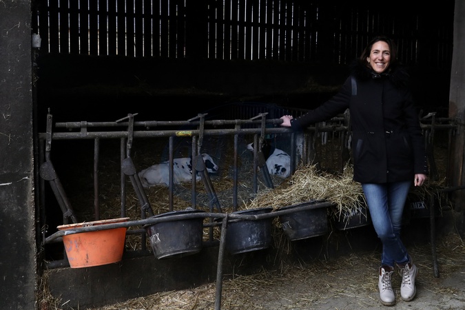 Valérie Hayer, tête de liste de la majorité, Renaissance pour les élections européennes est allée à la rencontre d'agriculteurs dans une ferme laitière lors de sa première visite dans le cadre des élections européennes, à Chémeré-le-Roi, près de Laval, en Mayenne, Bretagne, le 1er mars 2024. © Stéphane Lemouton / Bestimage Valérie Hayer, head of the majority list, Renaissance for the European elections, went to meet farmers on a dairy farm during her first visit as part of the European elections, in Chémeré-le-Roi, near Laval, in Mayenne, Brittany, on March 1, 2024.
