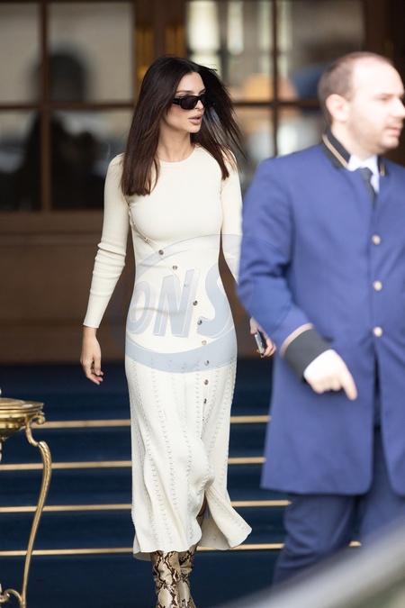 Emily Ratajkowski à à la sortie de l'hôtel Ritz lors de la mode femme automne / hiver 2024-2025 lors de la Fashion Week de Paris (PFW)