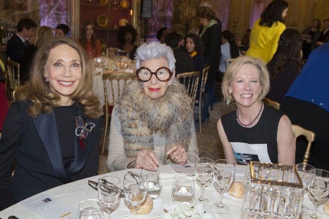 Info - Décès de l'icône de la mode, Iris Apfel, à l'âge de 102 ans - Marisa Berenson, Iris Apfel et Kathy Calvin, Présidente de la United Nations Foundation - Déjeuner Swaroski et United Nations Foundation pour "l'international women's day" à l'ambassade des Etats-Unis à Paris le 3 mars 2016. Swarovski & UN - special lunch in honor of International Women's Day in USA Embassy at Paris , Thursday, 3 March 2016.
