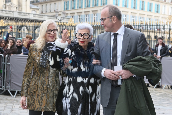 Info - Décès de l'icône de la mode, Iris Apfel, à l'âge de 102 ans - Iris Apfel et guest - Arrivées au défilé de mode "Christian Dior", collection prêt-à-porter automne-hiver 2016-2017 au musée du Louvre à Paris, le 4 mars 2016. © CVS/Veeren/Bestimage Arrivals at Christian Dior fashion show Fall/Winter ready-to-wear 2016-2017 at the Louvre Museum in Paris, on March 4, 2016.