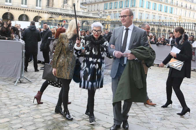 Info - Décès de l'icône de la mode, Iris Apfel, à l'âge de 102 ans - Iris Apfel et guest - Arrivées au défilé de mode "Christian Dior", collection prêt-à-porter automne-hiver 2016-2017 au musée du Louvre à Paris, le 4 mars 2016. © CVS/Veeren/Bestimage Arrivals at Christian Dior fashion show Fall/Winter ready-to-wear 2016-2017 at the Louvre Museum in Paris, on March 4, 2016.