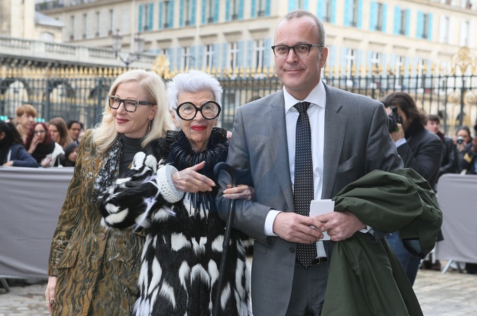 Info - Décès de l'icône de la mode, Iris Apfel, à l'âge de 102 ans - Iris Apfel et guest - Arrivées au défilé de mode "Christian Dior", collection prêt-à-porter automne-hiver 2016-2017 au musée du Louvre à Paris, le 4 mars 2016. © CVS/Veeren/Bestimage Arrivals at Christian Dior fashion show Fall/Winter ready-to-wear 2016-2017 at the Louvre Museum in Paris, on March 4, 2016.