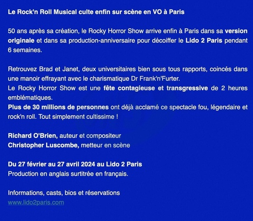 Exclusif - Communiqué de presse - Première du "Rocky horror picture show" à l'occasion des 50 ans de la création du spectacle au Lido 2 Paris à Paris, France. Le 1er mars 2024. © Christophe Clovis / Bestimage Exclusive - No Web - For Germany Call for price - Premiere of the "Rocky Horror Picture show" at Lido 2 in Paris, on the occasion of the 50th anniversary of the creation of the show. On March 1st 2024