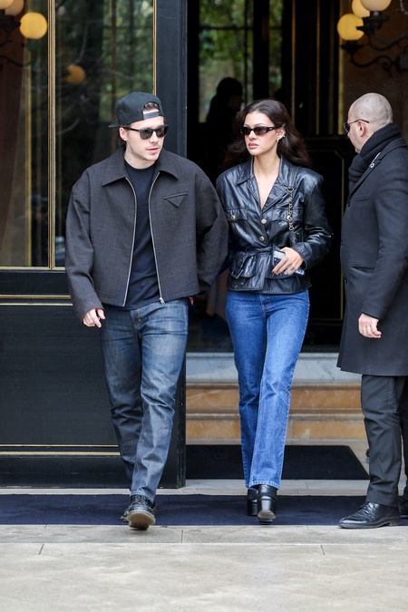 Brooklyn Beckham et sa femme Nicola Peltz à la sortie de l'hôtel La Réserve lors de la mode femme automne / hiver 2024-2025 lors de la Fashion Week de Paris (PFW), à PAris, France, le 2 mars 2024. Brooklyn Beckham and his wife Nicola Peltz at the exit of the La Réserve hotel during the fashion woman fall / winter 2024-2025 during the fashion week in Paris (PFW), in Paris, France, March 2, 2024.