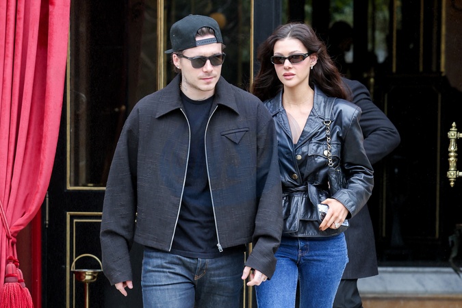 Brooklyn Beckham i jego żona Nicola Peltz opuszczają Hotel La Réserve podczas pokazu mody damskiej jesień/zima 2024-2025 podczas Tygodnia Mody w Paryżu