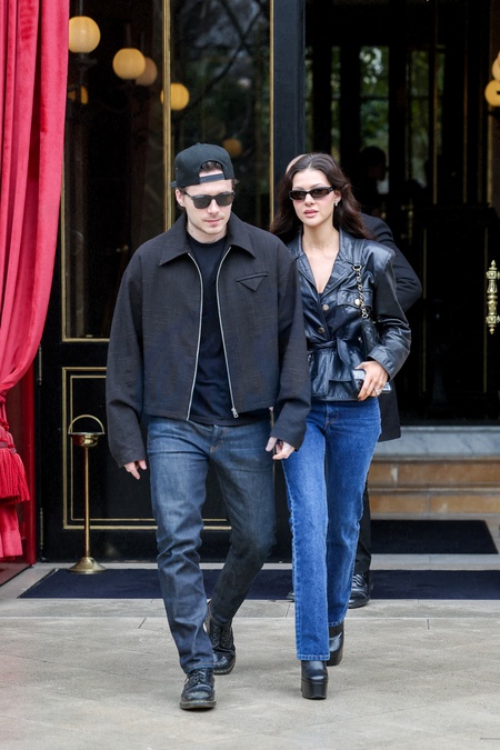 Brooklyn Beckham i jego żona Nicola Peltz opuszczają Hotel La Réserve podczas pokazu mody damskiej jesień/zima 2024-2025 podczas Tygodnia Mody w Paryżu
