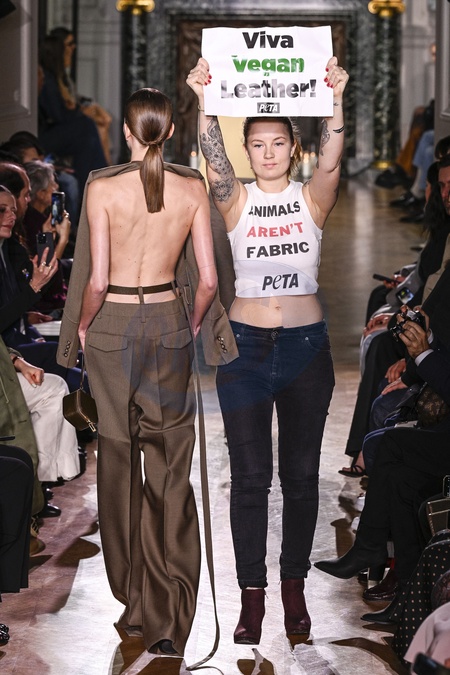 Une activiste PETA perturbe le défilé - Défilé Victoria Beckham mode femme automne / hiver 2024-2025 lors de la Fashion Week de Paris (PFW), à l'hôtel Salomon de Rothschild, à Paris, France, le 1er mars 2024. Victoria Beckham Womenswear Fall/Winter 2024-2025 show as part of Paris Fashion Week on March 1, 2024 in Paris, France.