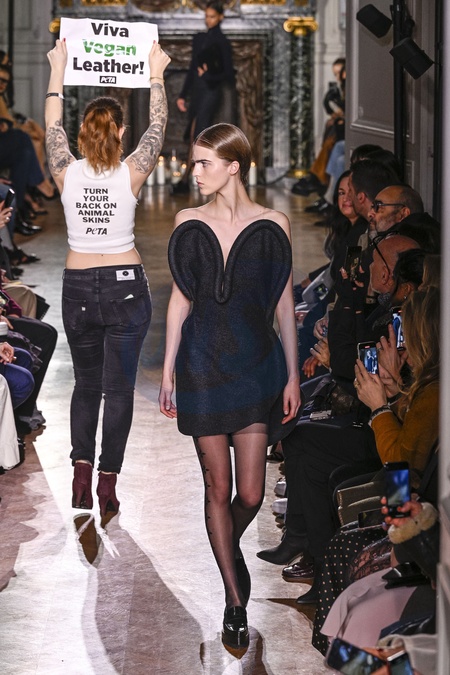 Une activiste PETA perturbe le défilé - Défilé Victoria Beckham mode femme automne / hiver 2024-2025 lors de la Fashion Week de Paris (PFW), à l'hôtel Salomon de Rothschild, à Paris, France, le 1er mars 2024. Victoria Beckham Womenswear Fall/Winter 2024-2025 show as part of Paris Fashion Week on March 1, 2024 in Paris, France.