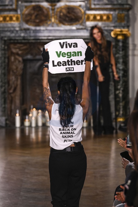 Une activiste PETA perturbe le défilé - Défilé Victoria Beckham mode femme automne / hiver 2024-2025 lors de la Fashion Week de Paris (PFW), à l'hôtel Salomon de Rothschild, à Paris, France, le 1er mars 2024. Victoria Beckham Womenswear Fall/Winter 2024-2025 show as part of Paris Fashion Week on March 1, 2024 in Paris, France.