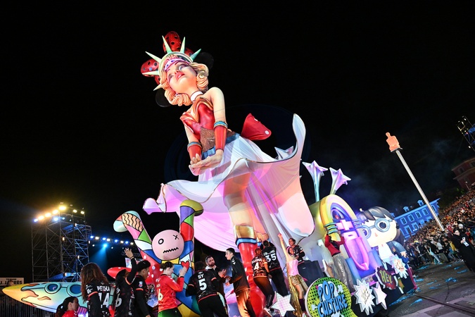 Le char de la Reine durant le corso carnavalesque illuminé du Carnaval de Nice 2024 "Roi de la Pop Culture", le 28 février 2024. Tous les corsos sont placés sous haute surveillance depuis déjà quelques années en raison de la menace terroriste. Pour cette nouvelle édition la municipalité a testé des nouveaux portiques de sécurité assistés par l'IA. Ce dispositif, expérimenté à grande échelle les jours de corsos, permet d'éviter les fouilles systématiques des spectateurs et pourrait être déployé à l'occasion des Jeux Olympiques de Paris. Utilisant l'intelligence artificielle, ces portiques, équipés d'une caméra, scrutent les passages sans pour autant «biper» pour un téléphone, des clés, un portefeuille, ou des pièces de monnaie dans les poches. En revanche, s'il s'agit d'une arme (même factice) ou d'un quelconque objet contondant, la machine passe du vert au rouge et l'individu est conduit vers une fouille physique. Reliés à une tablette, les portiques encadrent même en rouge la zone du corps à contrôler. L'agent peut ensuite préciser la nature de l'objet détecté. Avec ces portiques de la société américaine «Evolv technology», branche de «Algiz security», près de 4000 spectateurs à l'heure peuvent entrer dans l'enceinte sans forcément être palpé. C'est les 151 ans du Carnaval et la 139eme édition. L'événement se déroule du 17 février au 3 mars. Le Carnaval de Nice est le 1er carnaval de France et l'un des plus célèbres du monde, avec ceux de Rio et de Venise, attirant chaque année des centaines de milliers de spectateurs. © Bruno Bebert / Bestimage Illustrations of the 139th Nice 2024 Carnival. On February 28th 2024