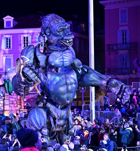 Illustration durant le corso carnavalesque illuminé du Carnaval de Nice 2024 "Roi de la Pop Culture", le 28 février 2024, ici un petit clin doeil au film King Kong. Tous les corsos sont placés sous haute surveillance depuis déjà quelques années en raison de la menace terroriste. Pour cette nouvelle édition la municipalité a testé des nouveaux portiques de sécurité assistés par l'IA. Ce dispositif, expérimenté à grande échelle les jours de corsos, permet d'éviter les fouilles systématiques des spectateurs et pourrait être déployé à l'occasion des Jeux Olympiques de Paris. Utilisant l'intelligence artificielle, ces portiques, équipés d'une caméra, scrutent les passages sans pour autant «biper» pour un téléphone, des clés, un portefeuille, ou des pièces de monnaie dans les poches. En revanche, s'il s'agit d'une arme (même factice) ou d'un quelconque objet contondant, la machine passe du vert au rouge et l'individu est conduit vers une fouille physique. Reliés à une tablette, les portiques encadrent même en rouge la zone du corps à contrôler. L'agent peut ensuite préciser la nature de l'objet détecté. Avec ces portiques de la société américaine «Evolv technology», branche de «Algiz security», près de 4000 spectateurs à l'heure peuvent entrer dans l'enceinte sans forcément être palpé. C'est les 151 ans du Carnaval et la 139eme édition. L'événement se déroule du 17 février au 3 mars. Le Carnaval de Nice est le 1er carnaval de France et l'un des plus célèbres du monde, avec ceux de Rio et de Venise, attirant chaque année des centaines de milliers de spectateurs. © Bruno Bebert / Bestimage Illustrations of the 139th Nice 2024 Carnival. On February 28th 2024